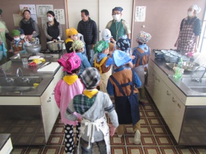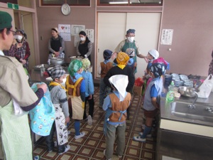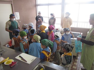 ビーバーたいは エプロンとずきんをかぶって ちょうりしつに しゅうごうして、 たいちょうから いろんな ちょうりどうぐの つかいかたを おしえてもらいました。 ちょうりするときは ほうちょうや ひをつかうので ケガをしないように ちゅういしようね。