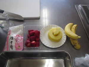 これが フルーツポンチをつくるためのどうぐと ざいりょうです。いちご・バナナ・パイナップル・しらたまこ。さあ、どんなフルーツポンチが できるのかな?