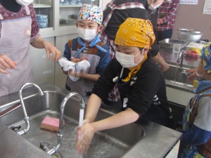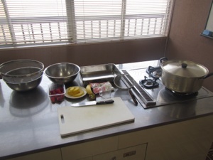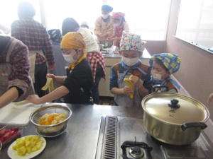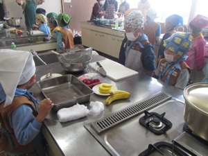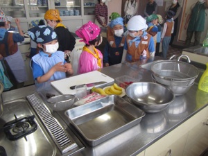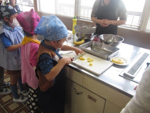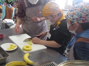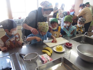 まず、てをあらって ちょうりかいしです。 さいしょは ほうちょうをつかって フルーツを カットしました。みんなは おかあさんたちに おしえてもらいながら しんちょうに さぎょうをしました。