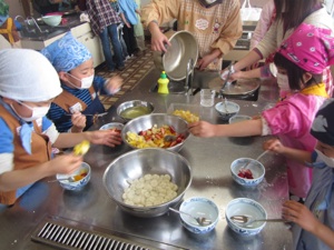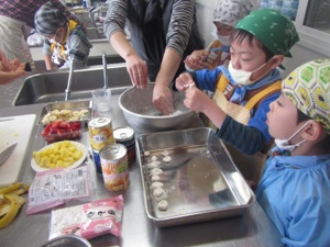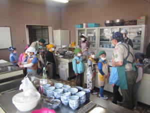 3がつ1かいめのビーバーたいのしゅうかいは、くりはらこうりゅうセンターで、おかあさんたちといっしょにデザートづくりにチャレンジしました。