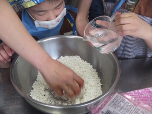 つぎは しらたまこをみずでとかして おだんごのもとをつくります。