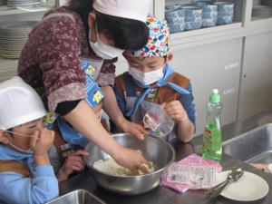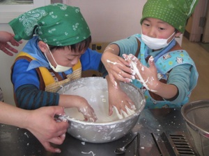ぎゅうぎゅうと しっかりこねて おだんごのもとを つくっています。