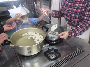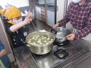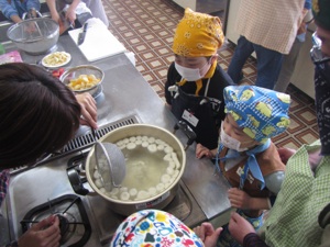 そのつぎは、おなべでおゆをわかして グツグツしてきたら おだんごをどんどん いれていきます。 いれた おだんごがプカプカと うかんできたら できあがりです。