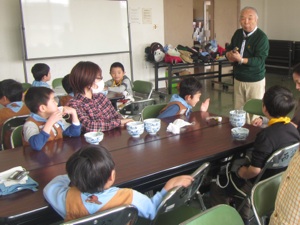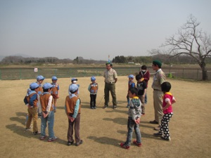さいごは、そとにでて おしまいのセレモニーをしました。 たいけんにゅうたいにきてくれた おともだちは げんきに じこしょうかいを してくれました。 そして たいちょうから きねんひんのプレゼントが わたされました。