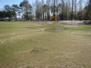 まえのひの あらしで こうえんの しばぶに たくさんの ふしぎな なみのもようが できていました。