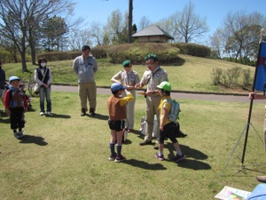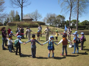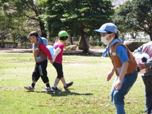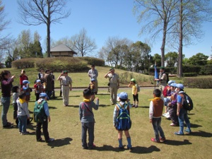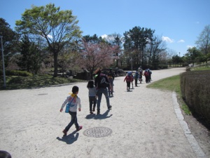 ゲームのあとは 「はる」をさがしに こうえんを たんけんしました。 ビーバーたいは かぜで ぼうしをとばされそうになりながら ひろいこうえんのなかを いちれつになって あるきました。