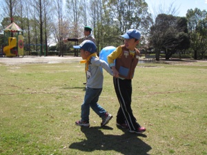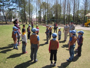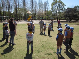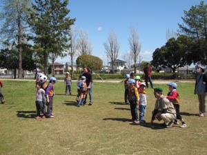 つぎは 「しんげんちは どこだ?」 というゲームを やりました。 わのなかに 「しんげんち」のひとが ひとりだけいて、 のこりのひとは 「しんげんち」のうごきを まねします。 そして、わの まんなかにたっているオニは みんなの うごきを よーくみて だれが 「しんげんち」なのかを あてるゲームです。 みんな とてもじょうずに うごきのマネをするので なかなかゲームが おわりませんでした。