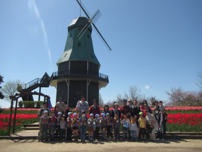 ふうしゃのまわりにはチューリップが いっぱいさいていて きれいでした。 とてもきれいな ふうけいだったので ふうしゃのまえで みんなと きねんしゃしんを とりました。
