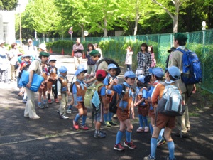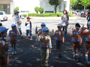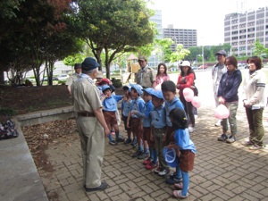 みんな きれいにならんで あるいて かっこよかったです。 とちゅうのこうえんには、しょうぼうたいいんと しょうぼうしゃがいたので けいれいで ごあいさつをしました。