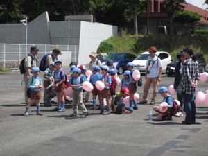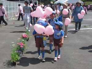 ピンクのふうせんをいっぱいもらって、かいかいしきの ごあいさつの おはなしを ききました。