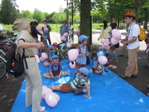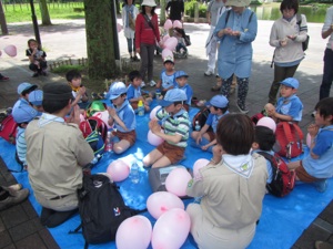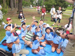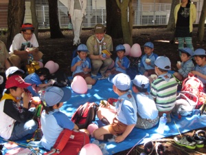 よていどおり おひるのじかんに おおしみずこうえんに ゴールしました。のどはカラカラ、おなかはペコペコです。 みんなよく がんばりました!! みんなそろって「いただきます」のあいさつをして、おべんとうをたべました。