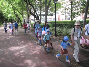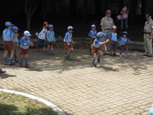 おやつのあとは、チームのじゅんばんをチェンジして ゴールの まつみこうえんにむけて しゅっぱつです。