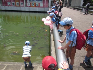 きゅうけいのあとは おおしみずこうえんをめざして あるいてきた みちをもどっていきました。 やっぱり、エキスポセンターのまえの いけで みちくさを しました。