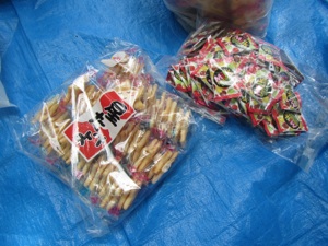 おみせでうる おかしセットは、4しゅるいの おかしをふくろにつめて ボーイスカウトのシールでとめて できあがりです。 おみせに きれいに おかしセットをならべて じゅんびかんりょうです。