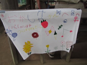 おかしのじゅんびのあとは おみせのかんばんを つくりました。 とっても かわいい カンバンができたね。 みぎのしゃしんは カブたいが つくってくれた カンバンです。