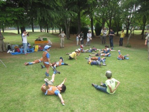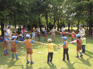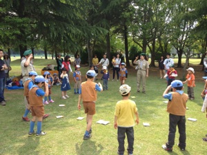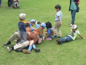 バザーのじゅんびが おわるまで カブたいといっしょに ひろばでゲームをして あそびました。 カブたいの くみのなかにいれてもらって ダンボール・キャタピラーリレーをしました。 リーダーや おとうさんたちも いっしょに リレーしたので たのしかったね。