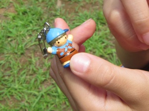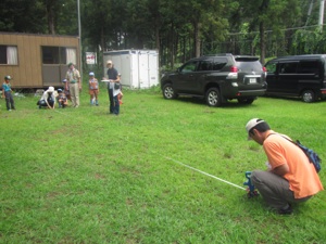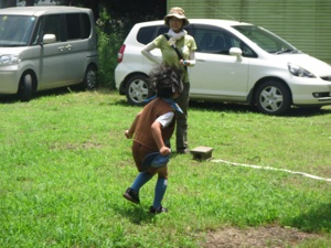 くつを おもいっきり とおくまで とばすゲームです。どれくらいとんだのかを おとうさんとおかあさんたちが メジャーをつかって はかってくれました。