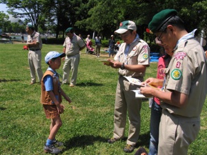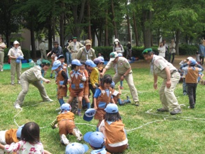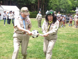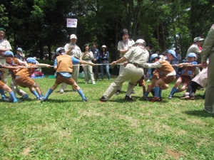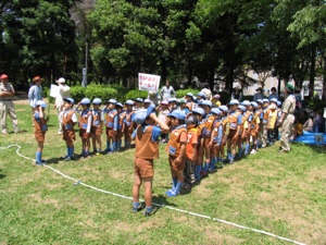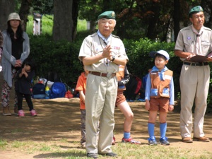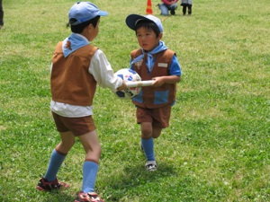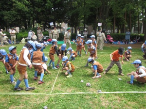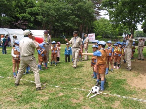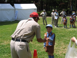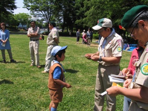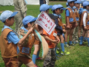 さて、いよいよ さいごのゲームです。ひとりずつ だんいいんちょうのところに はしっていって おおきなこえで じぶんのたいと なまえを いって あいさつをします。 じょうずに できたスカウトには ごほうびに プレゼントがあるよ。