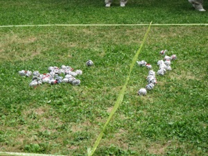 ひとつめのゲームは、「ばくだんしょりゲーム」です。じぶんのチームのコートのなかから ばくだんを ひろって あいてのチームのコートのなかに すてるゲームです。さいごに ばくだんのかずが すくないほうの チームが かちです。