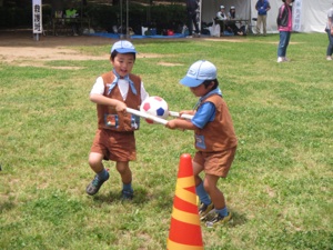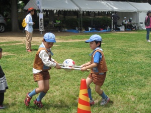 二人で、ぼうにボールをのせて コーンのところまで いって もどってくるリレーです。
