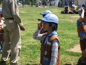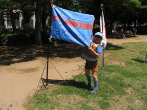 セレモニーでは 4ほんのビーバーたいの はたに けいれいをして みんなで ビーバースカウトの 「やくそく」と「きまり」を がっしょうしました。