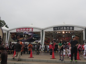 このひは ゆうがたに つくばえきの ちかくの おおしみずこうえんに しゅうごうしました。こうえんには たくさんの おおきな ねぶたが パレードの じゅんびを していました。
