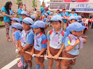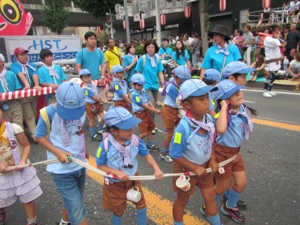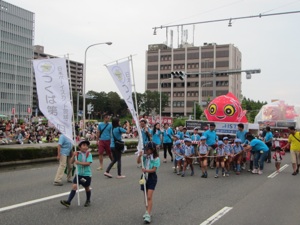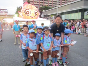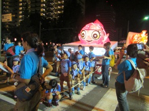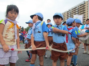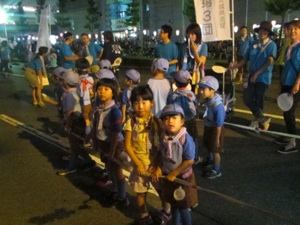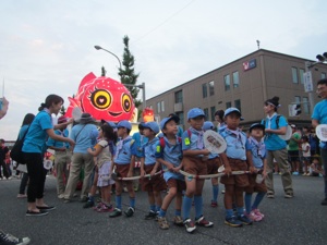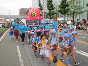 カブスカウトの おにいさんと おねえさんの あとにつづいて ビーバースカウトたいは ねぶたをひいて しゅっぱつしました。 いつもは クルマが はしっている ひろいどうろをパレードしたので とても きもちよかったね。