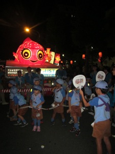 みんなで げんきに あかい きんぎょの ねぶたをひいて、なつのよるの おまつりを たのしみました。