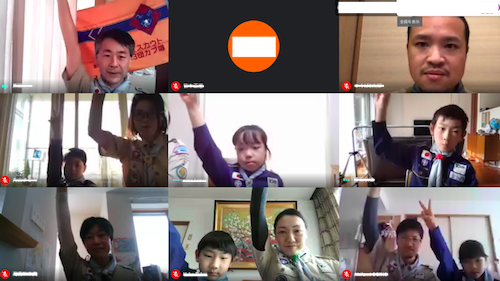 集会のはじめには、みんな元気にスカウトサインです。