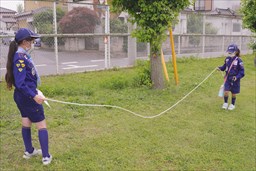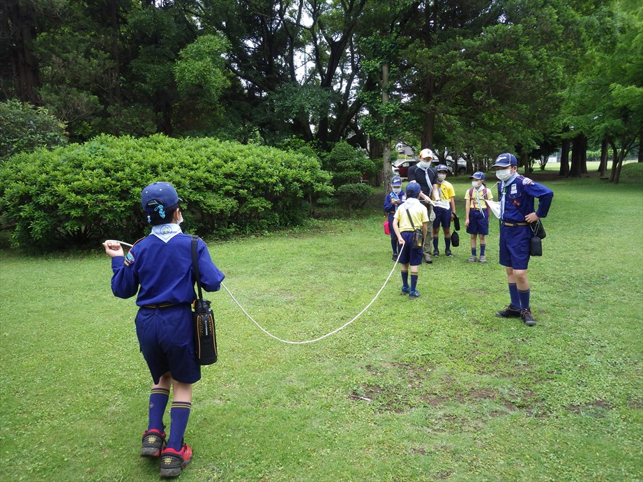 ロープを使った訓練では、「ロープ相撲」や、ロープ結び(8の字、はなむすび、もやい、ほんむすび、ひきとけ、一重つぎ、ふた結び)を練習しました。