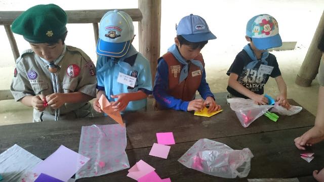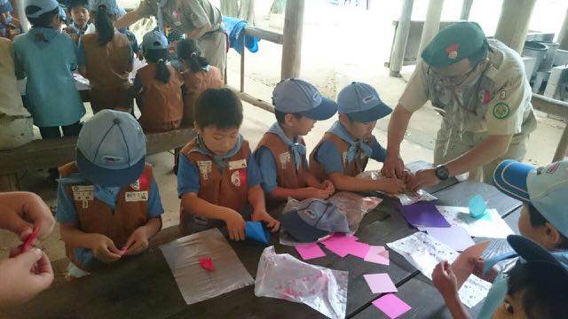 土浦青少年の家で、日本連盟のピースプログラム“ORIZURU”プロジェクトのための折り鶴を作りました。スカウトたちは、折り方をお互いに教えっこしたり、ボーイ隊とベンチャー隊のスカウトのお兄さんお姉さんに手伝ってもらいながら、なかよく折り鶴を仕上げていました。