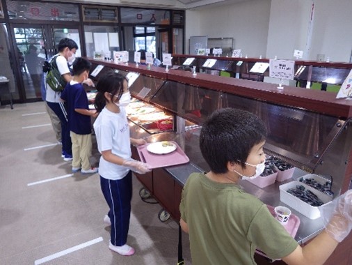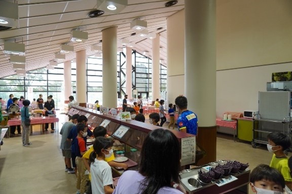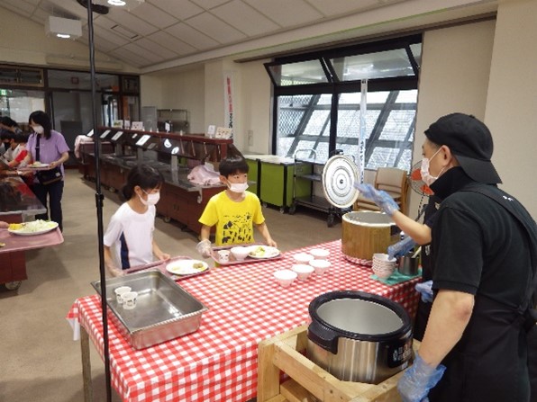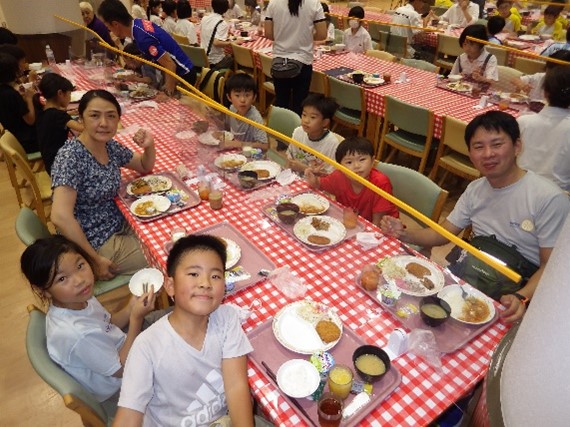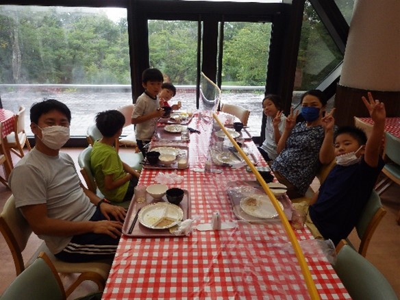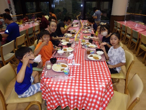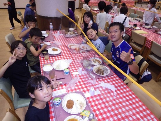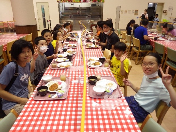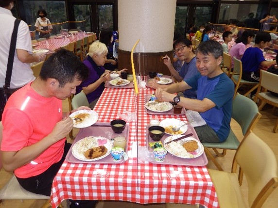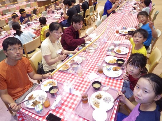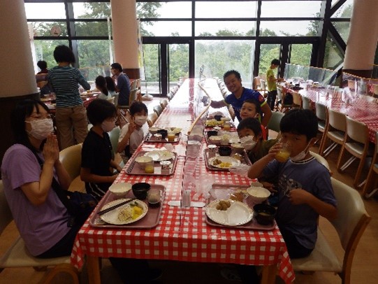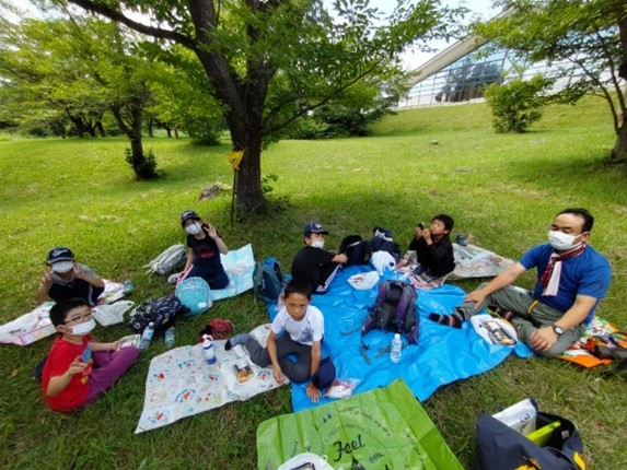 青少年交流の家に戻って、今日も芝生の上で組毎に昼食のオニギリを頂きます。