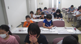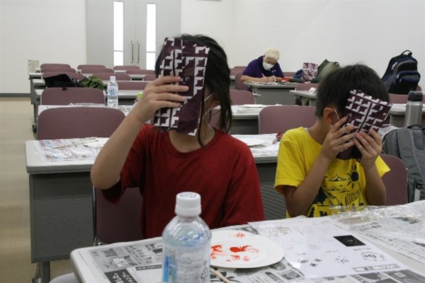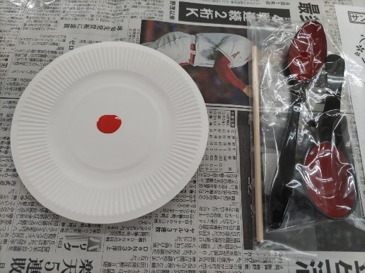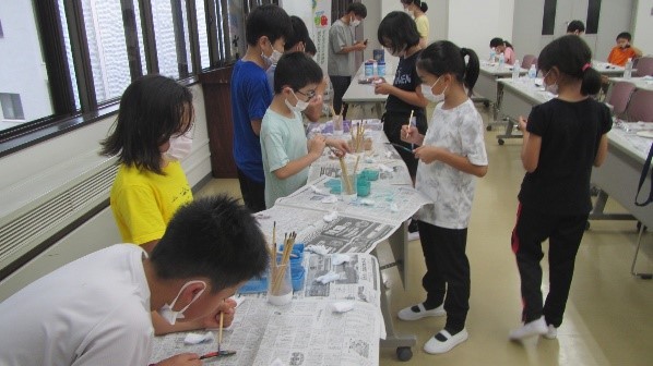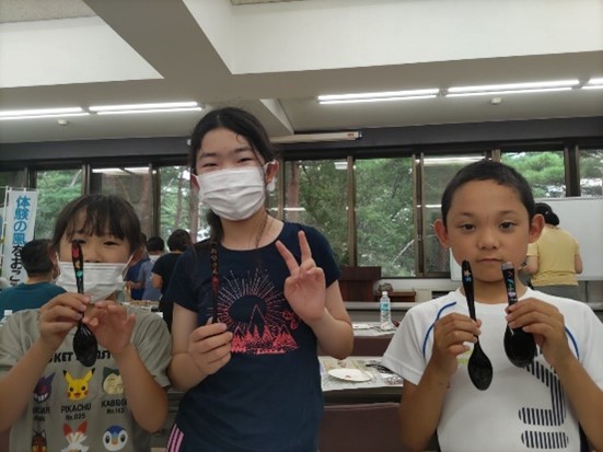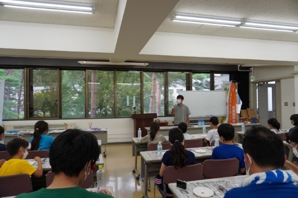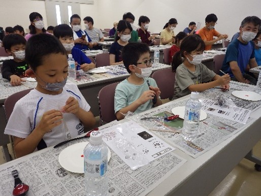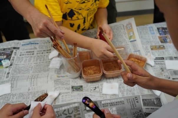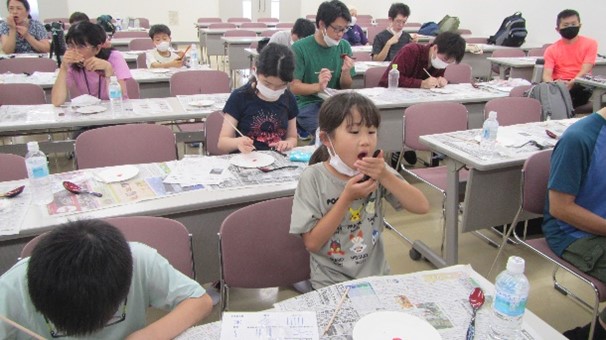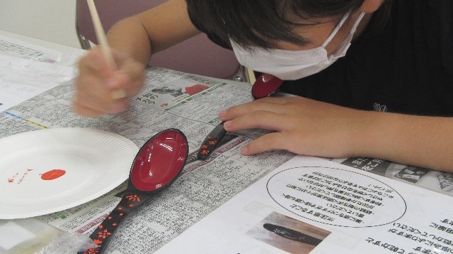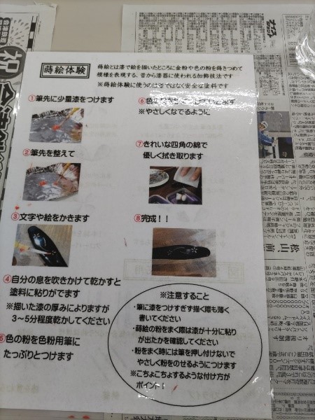 昼食後は室内に戻り、研修室で講師の先生のお話を聞いて、会津漆蒔絵の工作を行いました。