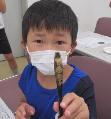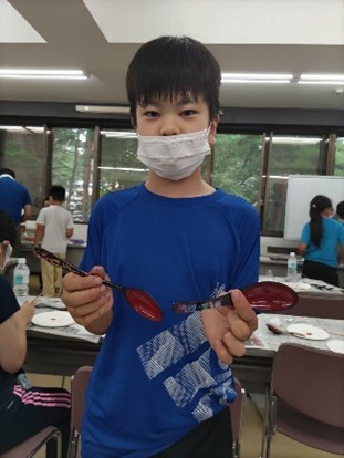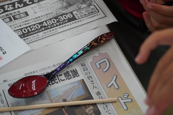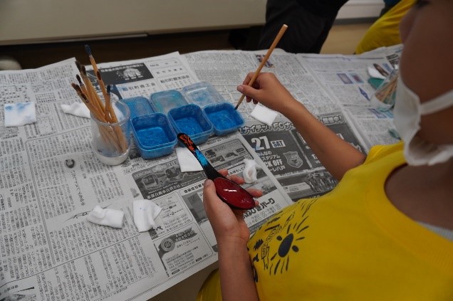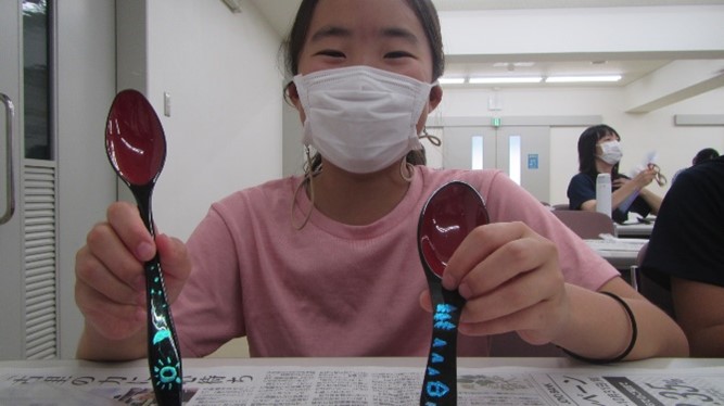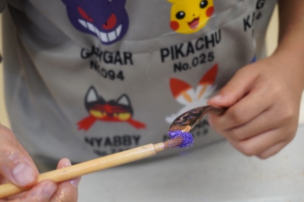 触れてもかぶれない工作用の漆を使用してスプーンの柄に模様や字を描きます。
