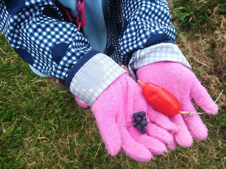 (左上から、あけび、カラスウリ、巨大ミミズ(猪の好物)、蜂の巣、モグラの死骸
