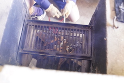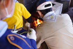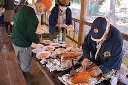 くま好物のサケを焼くための準備として、火おこしをしました。