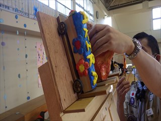 ステキなアートが4つ、組の数だけ出来上がりました。ペンキで汚れて、お家で起こられたスカウトはいないかな(^^;