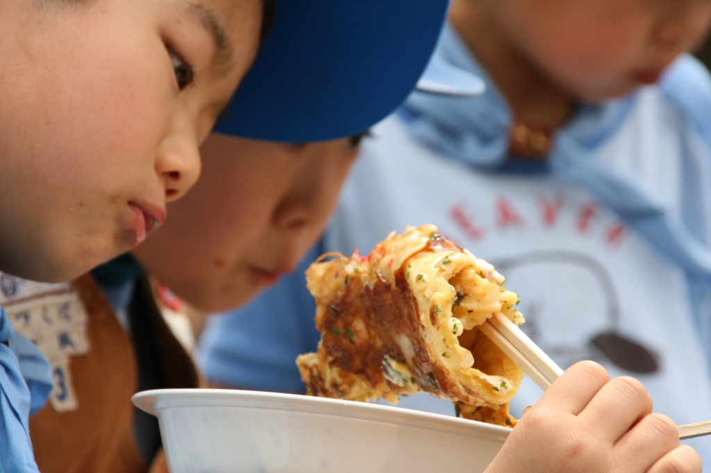 お昼ごはんは、「くるくるおこのみ」をみんなでいただきました。お好み焼きは、巻いて食べると不思議な食べ物になっていたので、みんな驚いていました!