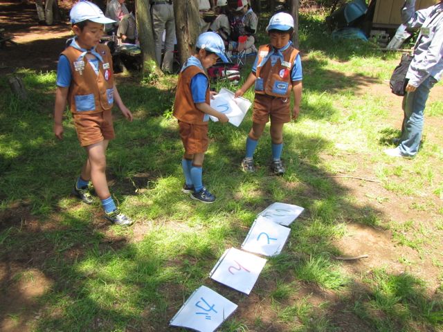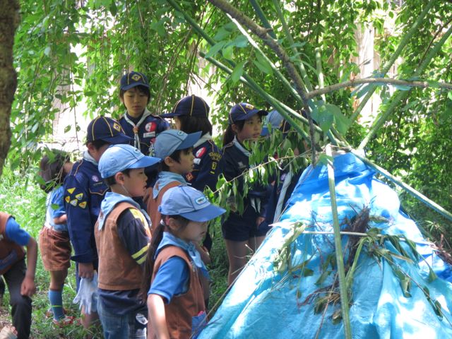 ネイチャーゲームでは、リーダーが用意した5つの草花と同じものを森の中から探してくるというゲームをやりましたが、スカウトたちはとても熱心に森の中を走り回って探し当ててくれました。また、森の中に隠した文字カードを拾い集めて、みんなで協力して言葉をつくるゲームもしました。当日は「母の日」にちなんで、「おかあさん いつも ありがとう」の言葉をつくってもらい、集会に同伴したお母さんたちに感謝の言葉を投げかけてくれました。そのあとは、同じ場所で活動中のカブ隊が作った「森の中の秘密基地」を訪問して、カブ隊の活動を体験しました。もうすぐ上進するビッグビーバーたちが秘密基地に目を輝かせている様子がとても面白かったです。
