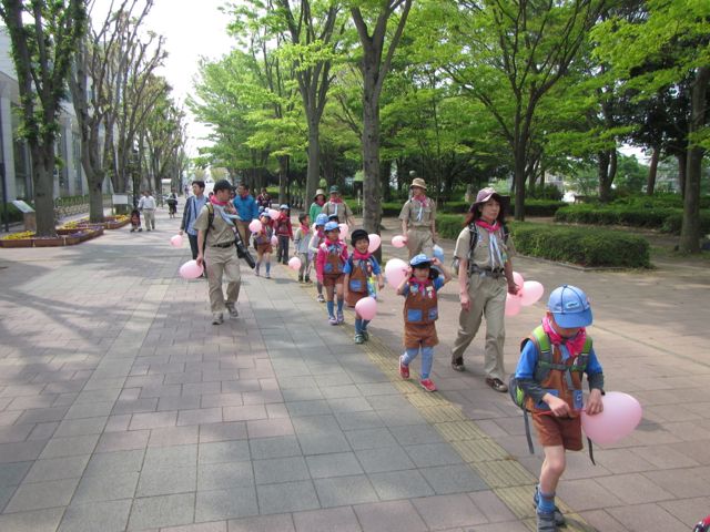ウォーキングしました。そして中央公園では、旗揚げゲーム・絵合わせゲーム・しっぽとりゲームなどのグループゲームで遊びました。その後、研究学園駅から歩いてきたカブスカウト隊・ボーイスカウト隊と合流してウォークラリーのゴールに向かい、全員でゴールの喜びを分かち合いました。