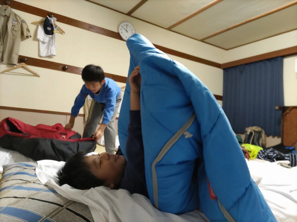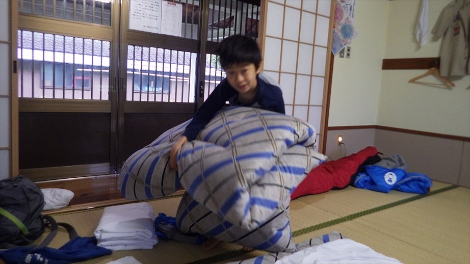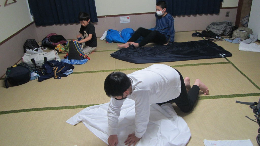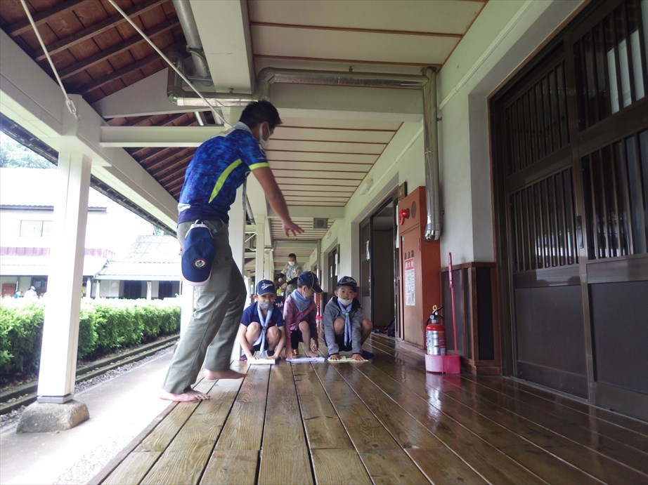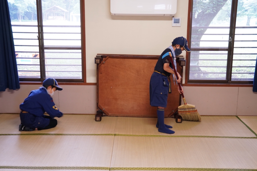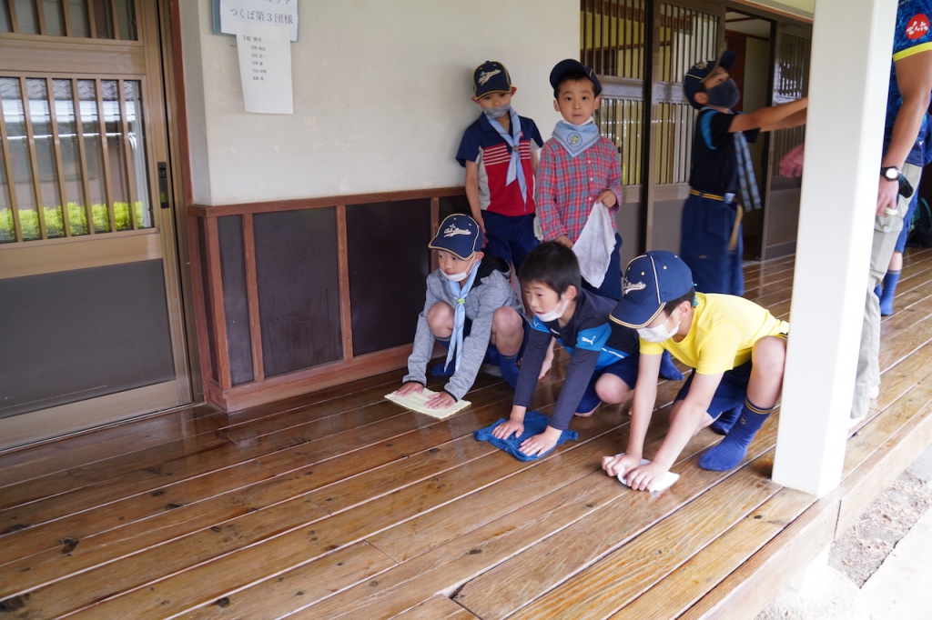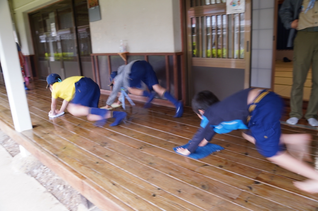朝食が済んだら着替えて、大きな荷物を部屋から移動させた後に、部屋の掃除です。室内はもちろん、廊下も階段も掃き掃除のあと、雑巾がけを行います。こらこらレースをするんじゃない。と思ったら、スターターをデンリーダーがやっていました。ま、キレイになっていることだし、ヨシ!