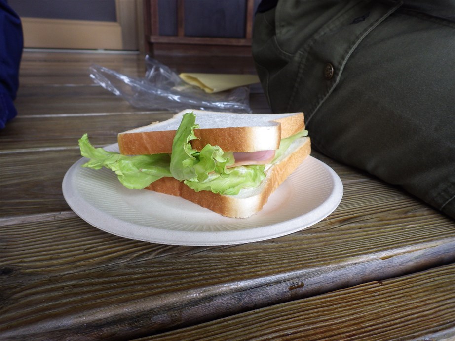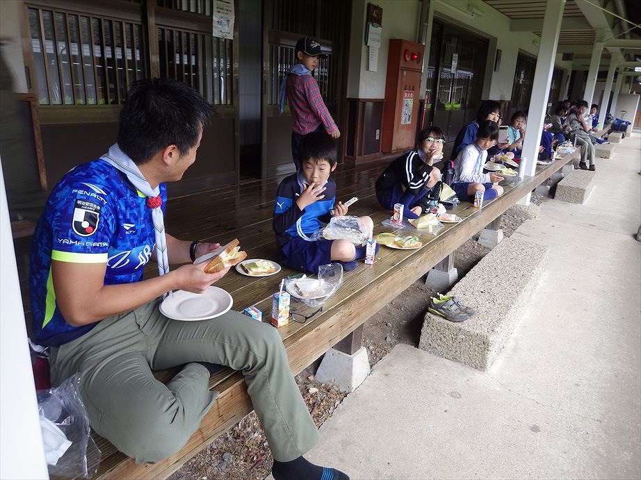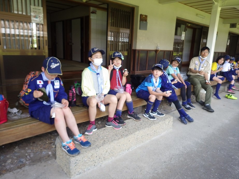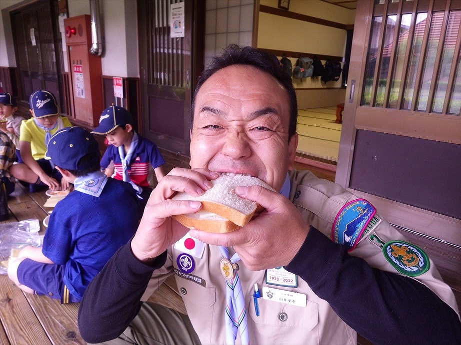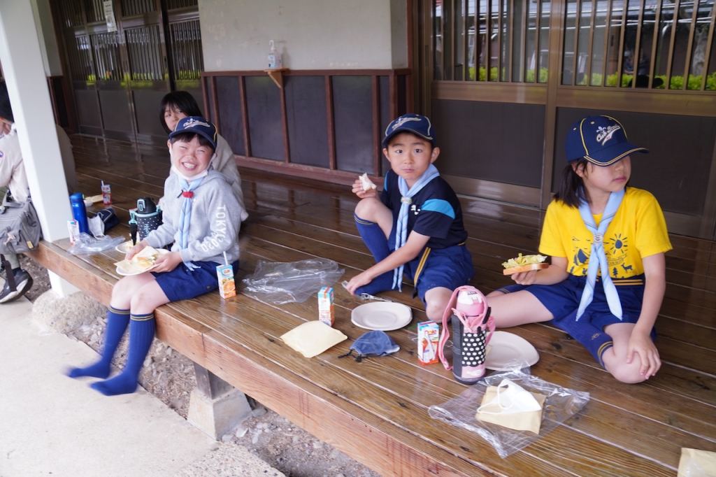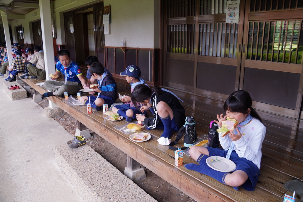 7時に集合がかかります。隊長のダッシュに合わせて皆でウエーブをした後、各組毎に縁側に座りながらの朝食です。今日の朝はレタスとハムとチーズのサンドイッチです。皆で並んで食べると何だか美味しいね。