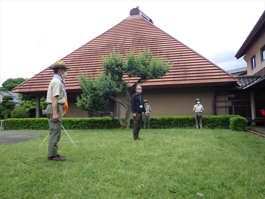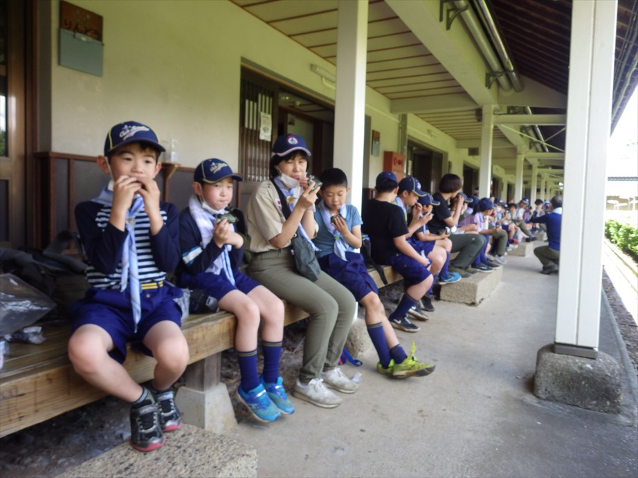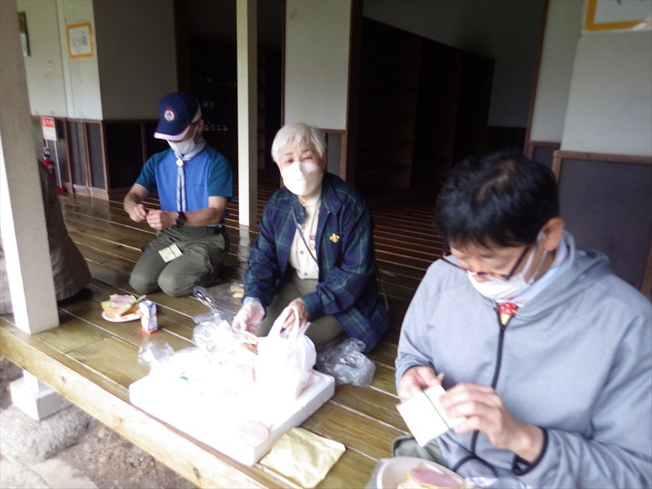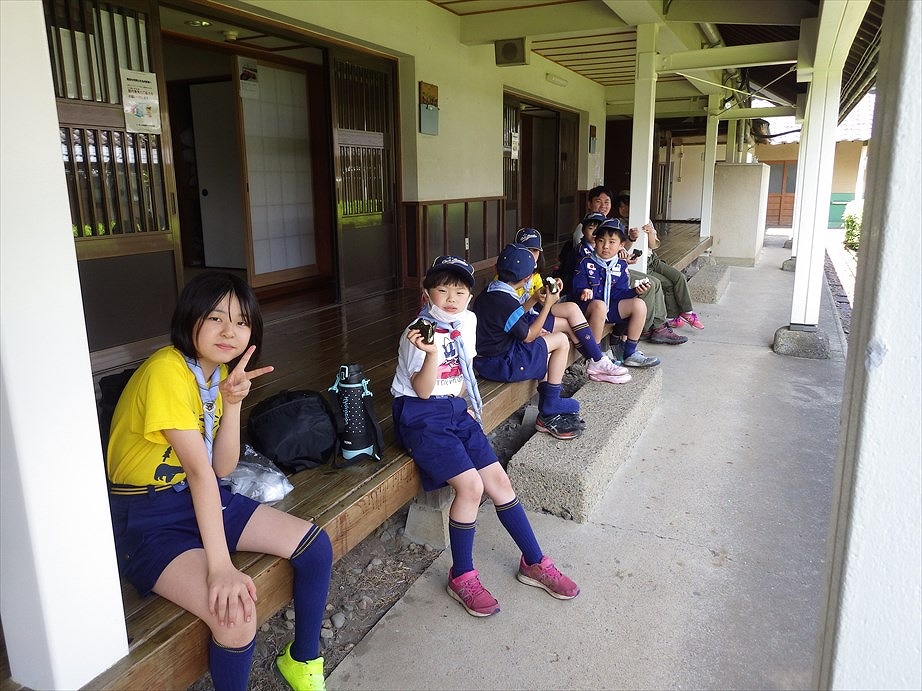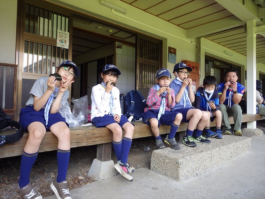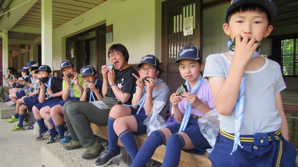 昼食は朝と同じく縁側で並んでコンビニおにぎりです。スカウト達はコンビニおにぎりが大好きです。「コンビニのおにぎりが一番うまい」。でも家に帰ったら、お母さんのおにぎりが世界一だって言うんだぞ。