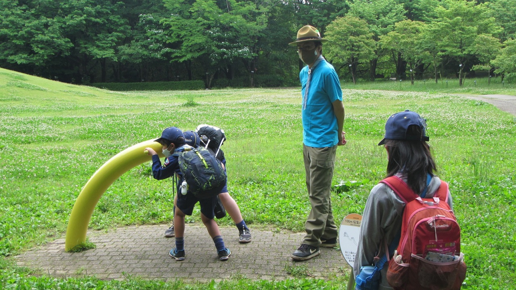 100mの伝言パイプの向こうから聴こえてくる、伝言文を聴き取れ!全神経を使って、授業中より真剣に聞いているスカウト達。