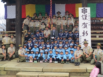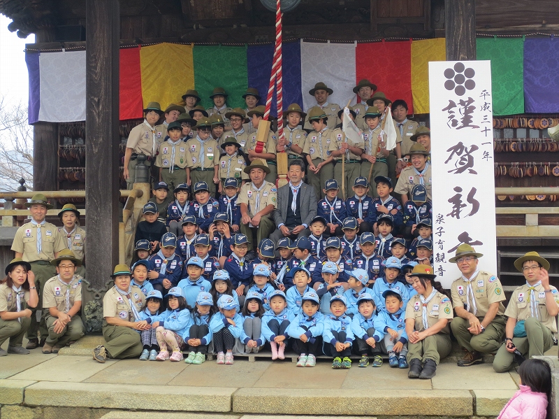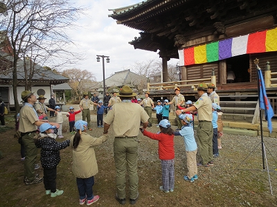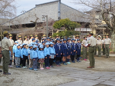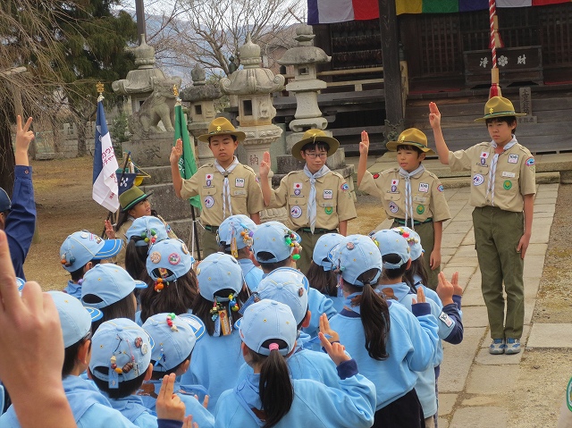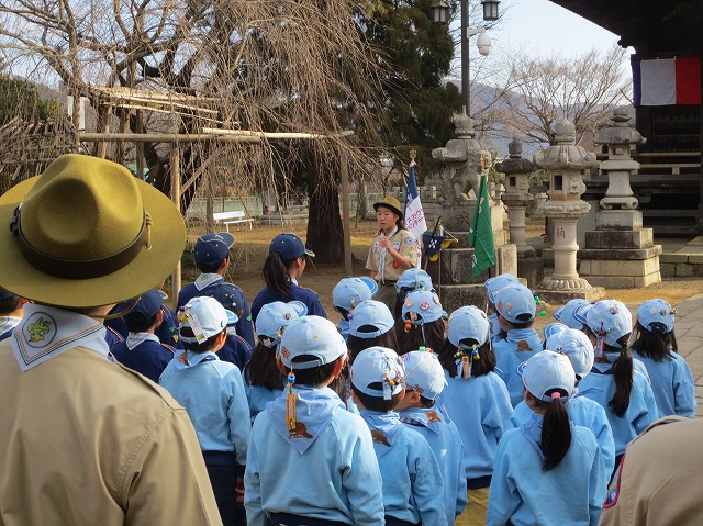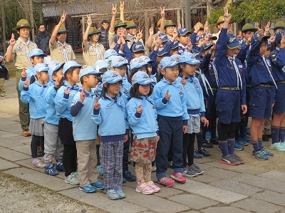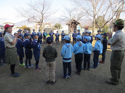 ここで、毎年最初の集会は、カブ、ボーイ、ベンチャースカウトのお兄さんお姉さん達と一緒に、恒例の年頭式を行います。