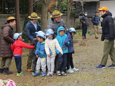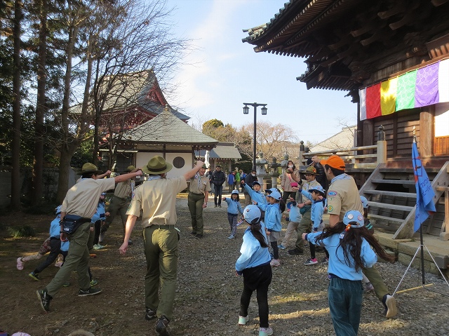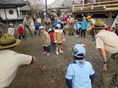まずは各隊に別れて、身体を温めましょう。お寺の本堂の周りを1周して、隊長の指定した時間ピッタリにゴールしたスカウトの勝利です。