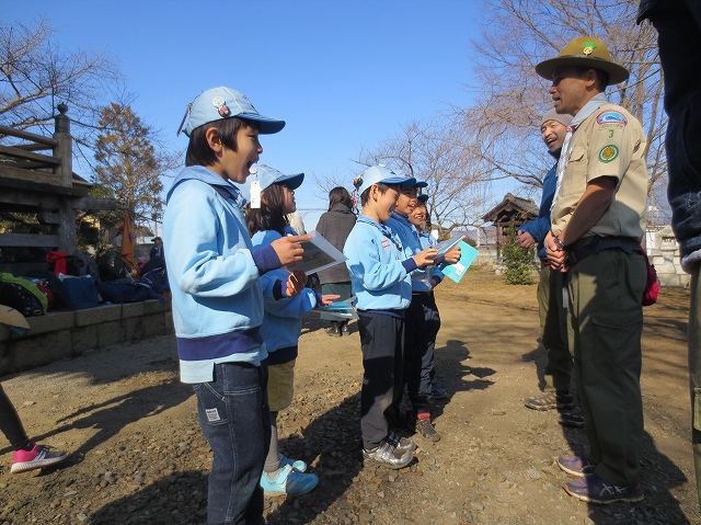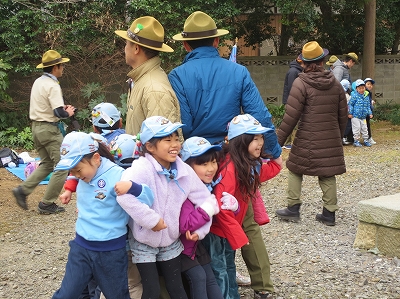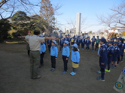 次はつくば3団全員揃っての年頭式です。ビーバーのみんなも寒さに負けずに上着を脱いで参加しています。ミニビーバーも含めて誰一人おしゃべりしたりふざけたりしないのは、さすがです。 秋ぐらいから気づいてはいましたが、4月から比べてミニビーバー、本当にしっかりできるようになりましたね。「スカウトは誠実である」「スカウトは友情にあつい」「スカウトは質素である」言葉の意味はわからなくても、何か感じるものがありました。