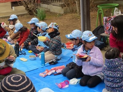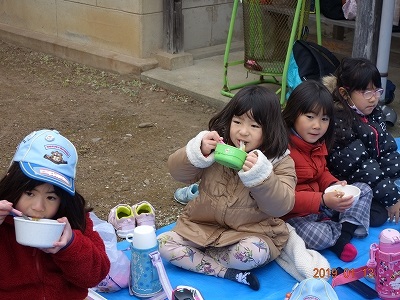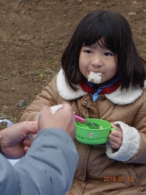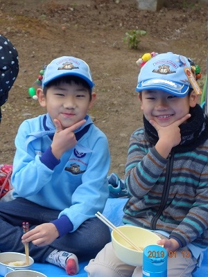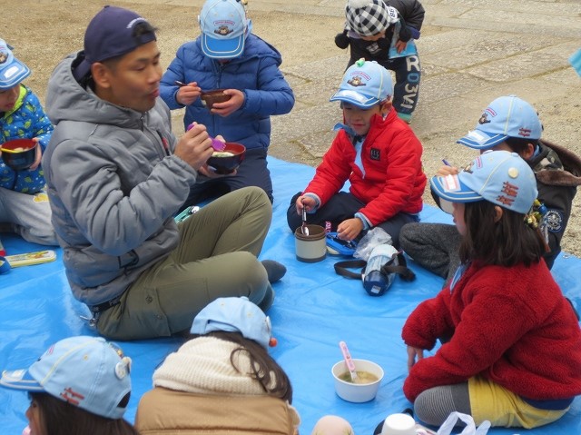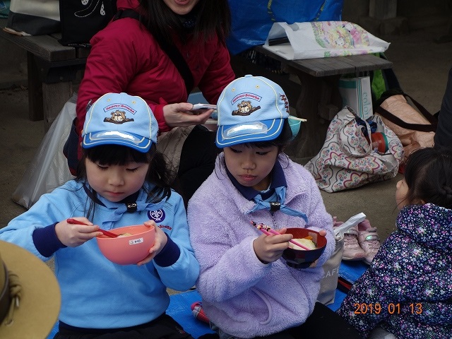 多くのお母さん達のご協力のもと、おいしいおいしいお雑煮ができましたよ! 大根、白菜、人参、鶏肉、ゴボウにネギ、お餅が伸びる伸びる。ああ、日本に生まれて良かったなあ。お代わりもあるよ。
