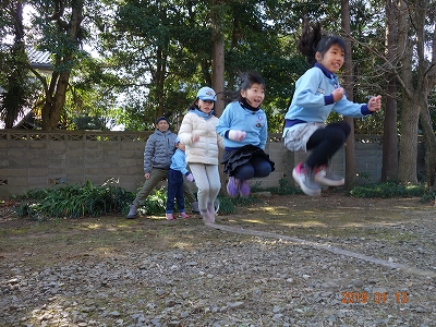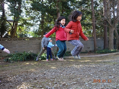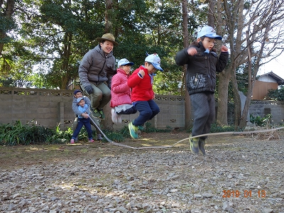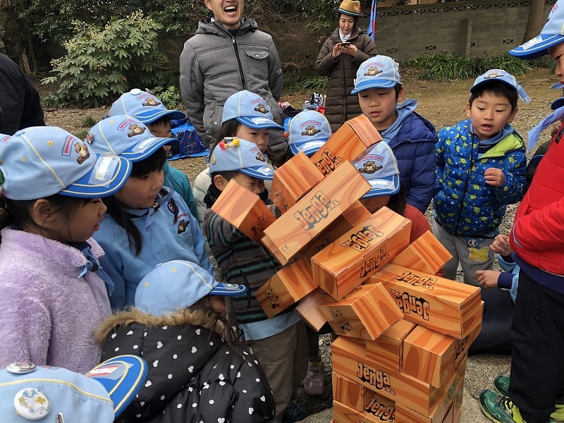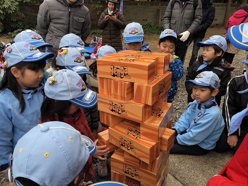 ビーバー、ミニビーバーは、ビッグジェンガと大縄跳びで遊びます。かたやバランス感覚と頭を使い、もう一方で上着を脱ぎ捨てお友達との息を合わせたジャンプします。