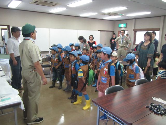 当日は朝から大雨というコンディションでしたが、スカウトたちはカッパを着ていつもどおり元気に集会に参加してくれました。今回は記念品づくりというテーマで「藍染め」にチャレンジしました。